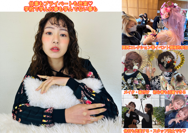 | 業務内容 | サロン業務全般 従業員数40名 男女比 男性1割女性9割 平均年齢25歳 【入社後の服装髪型規定について】 ドレスコード/お客様からみて不快の無い格好 髪色/汚くなければOK アクセサリーOK、タトゥー見える場所はNG 【手荒れ対策】 アイラッシュ、エステティシャンへの移行 【入社後研修】 4月~5月 スタジオ研修(週3日)、休み2日、土日サロンワーク 【着付・メイク】 着付け/1級講師免許取得者が講師 メイク・ヘアメイクにも幅広く対応 【スタイリストになってからの兼任】 アイラッシュ、脱毛、エステティシャン 【スタイリストデビュー】 1.5~2年 |