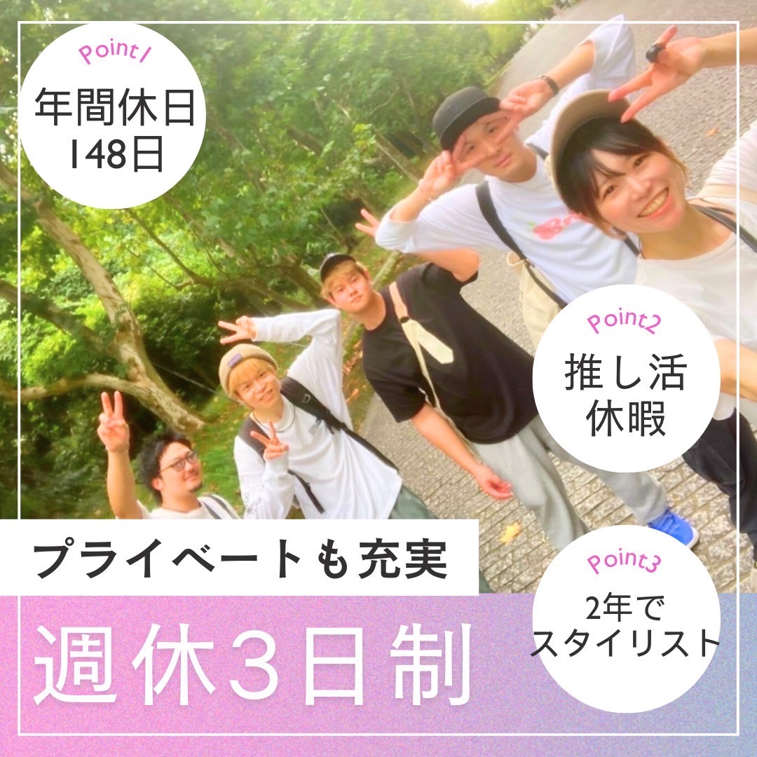 【週休3日制】【年間休日148日】【推し活休暇/土日可】【〜2026年4月新店舗オープニングスタッフ募集】【カリキュラム充実】【2年でスタイリスト】 口コミ4.9以上の高評価を頂ける技術と知識をあなたにお伝えします!一緒に最高の美容室を作りましょう!